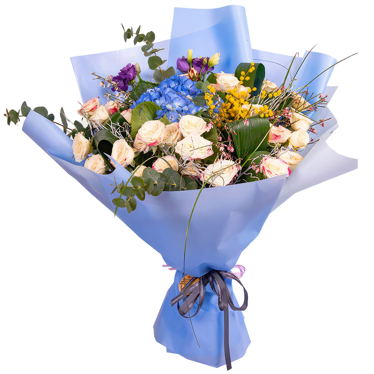 Гортензия синяя, роза кустовая бело-розовая, мимоза, эустома фиолетовая, аспидистра, эвкалипт. Упаковка (лента, пленка, крафт, сетка, пленка матовая)