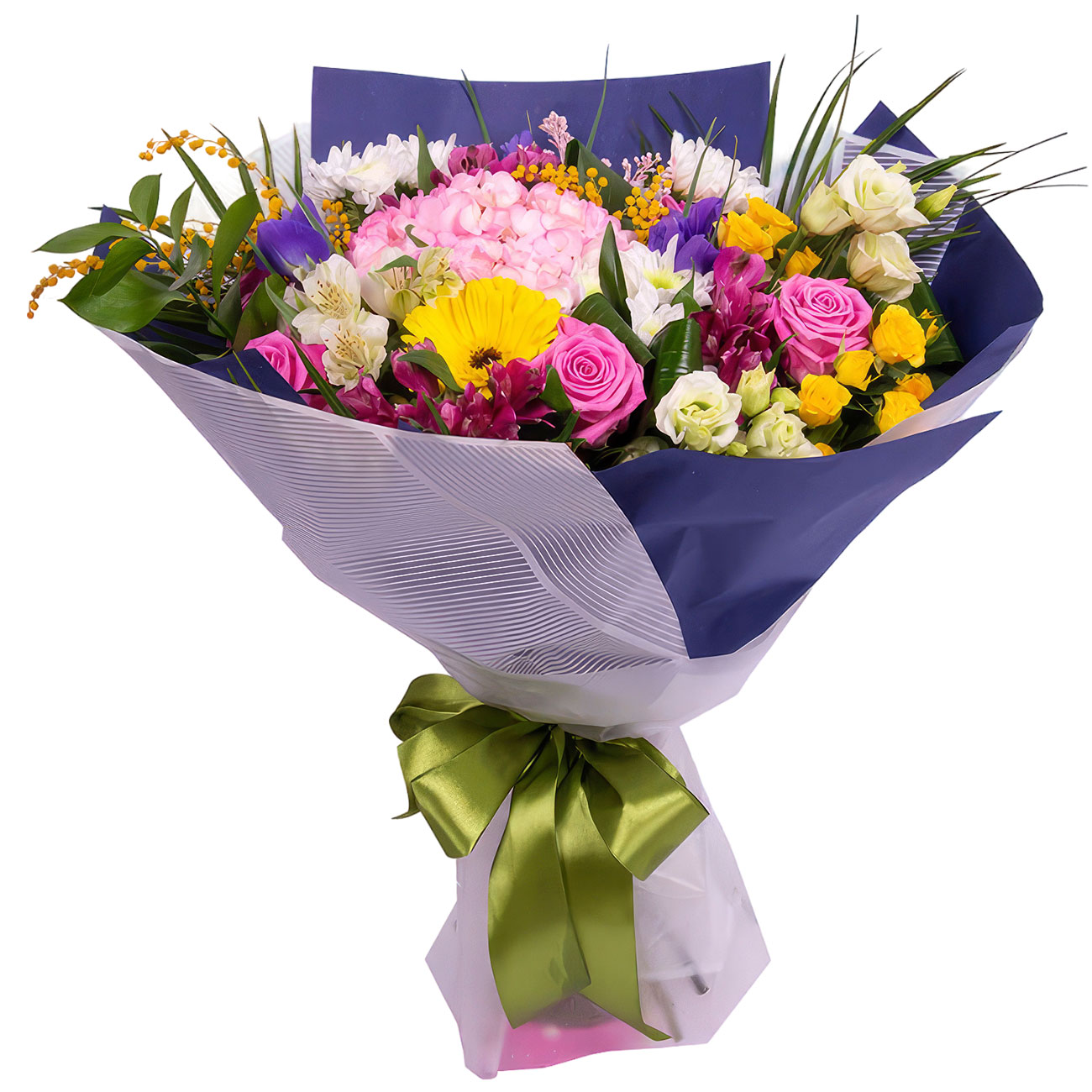 Гербера желтая, альстромерия розовая, роза одноголовая розовая, эустома белая, роза кустовая желтая, ирис фиолетовый, хризантема кустовая белая, мимоза, гортензия розовая, салал, зелень. Упаковка (лента, пленка, крафт, сетка, пленка матовая)