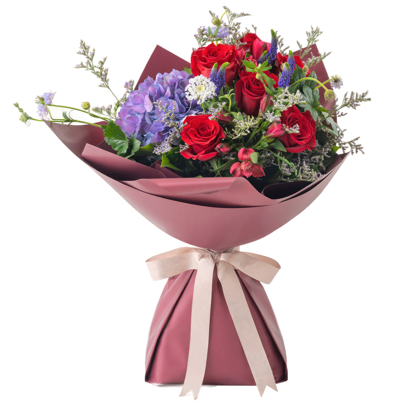 Роза одноголовая красная, вероника, гортензия фиолетовая, альстромерия красная, каспия. Упаковка (лента, пленка, крафт, сетка, пленка матовая)