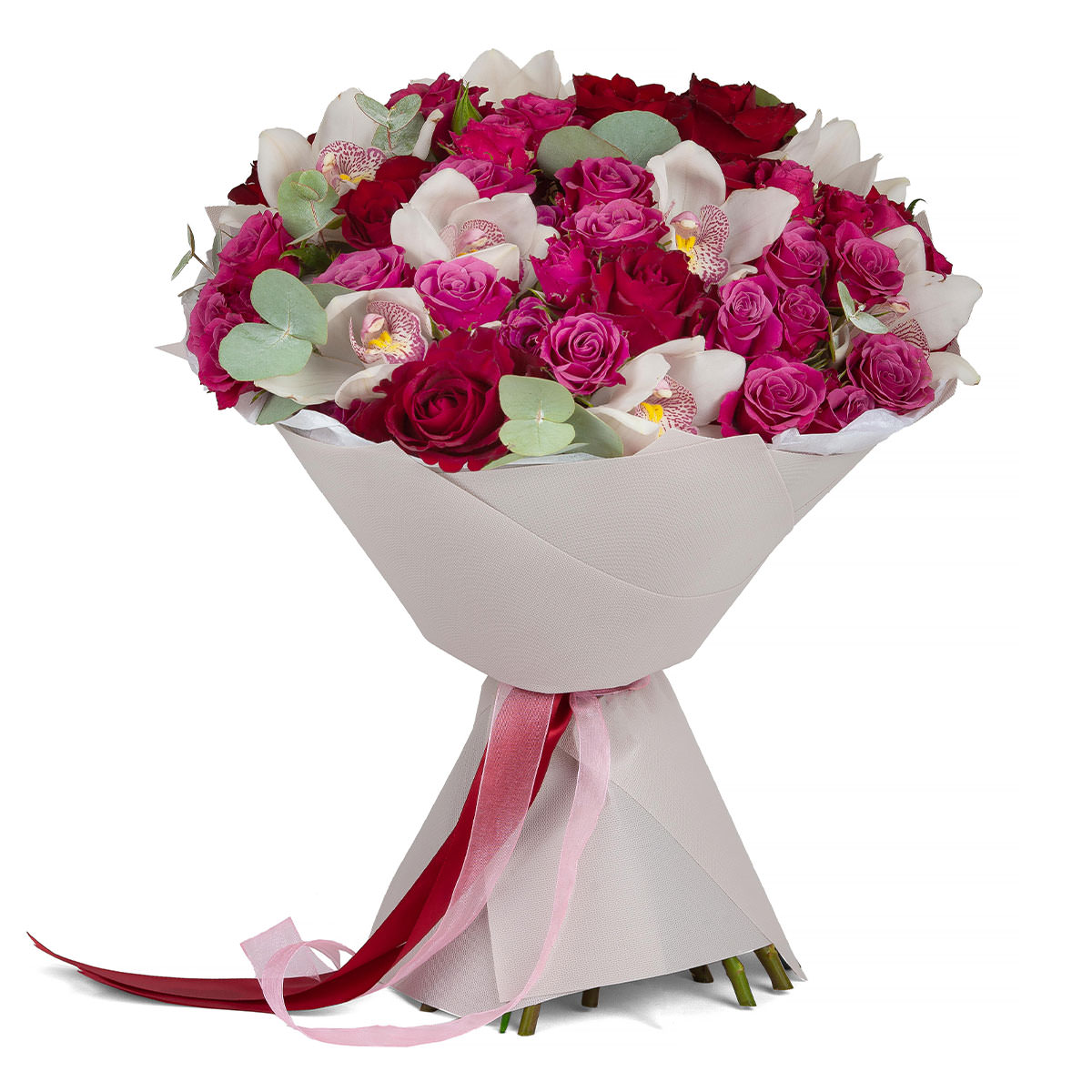 | Состав | Кустовые розы, Орхидеи, Розы, Эвкалипт |
