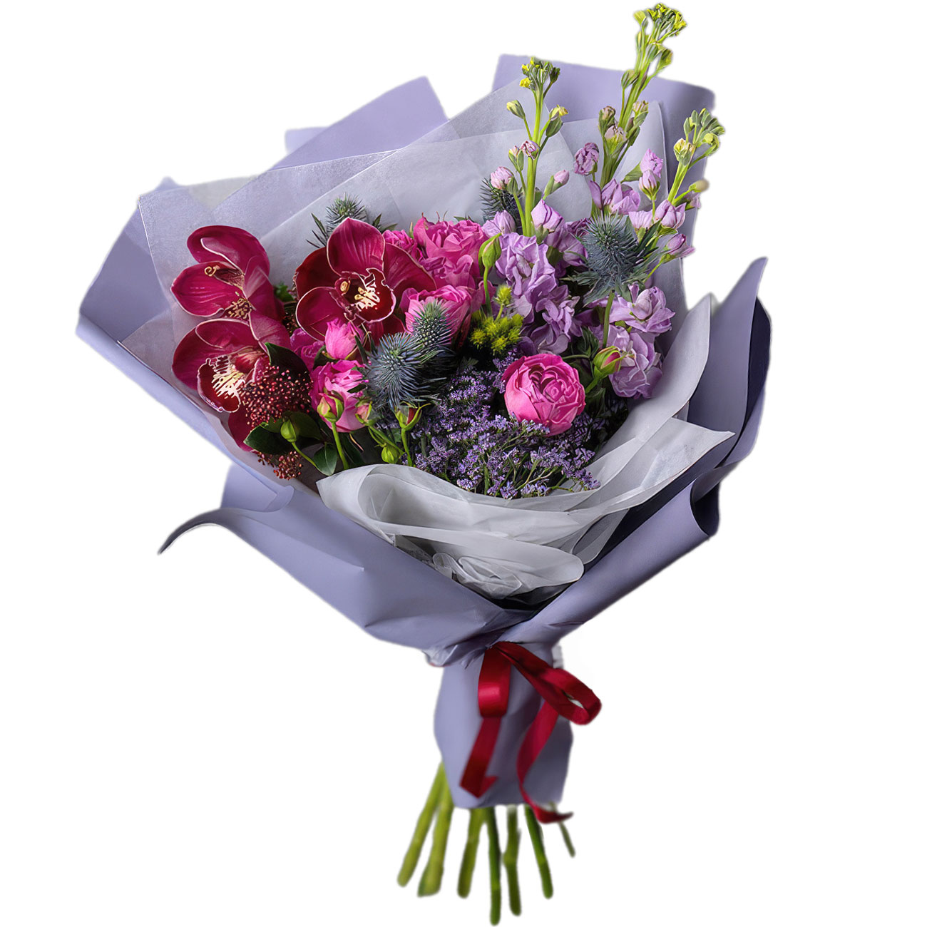 Эрингиум, орхидея розовая, маттиола сиреневая, роза кустовая пионовидная, статица, озотамнус. Упаковка (лента, пленка, крафт, сетка, пленка матовая)