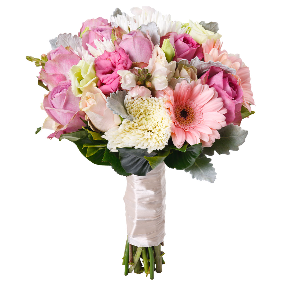 Роза одноголовая розовая, гербера розовая, хризантема одноголовая белая, эустома белая, зелень. Упаковка (лента, пленка, крафт, сетка, пленка матовая)