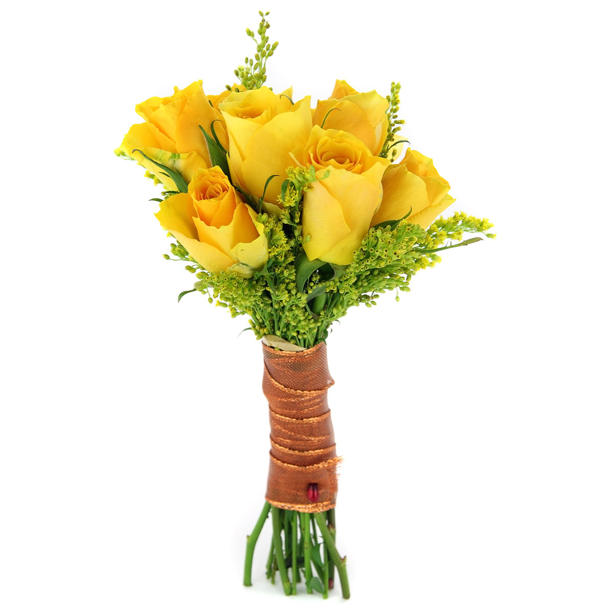 Роза одноголовая желтая, солидаго. Упаковка (лента, пленка, крафт, сетка, пленка матовая)