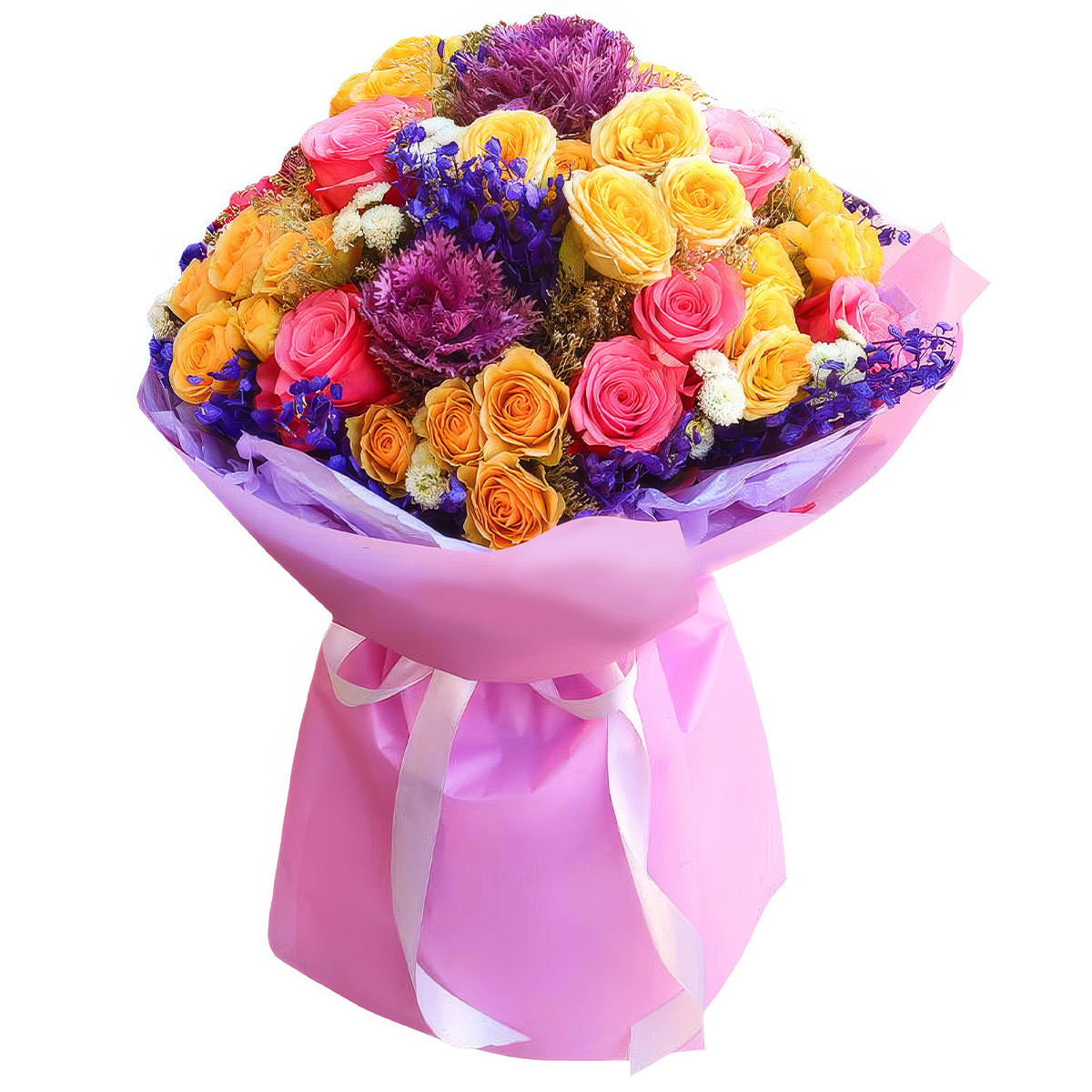 Роза одноголовая розовая, роза кустовая желтая, брассика сиреневая, хризантемы мини белые, лунария синяя. Упаковка (лента, пленка, крафт, сетка, пленка матовая)
