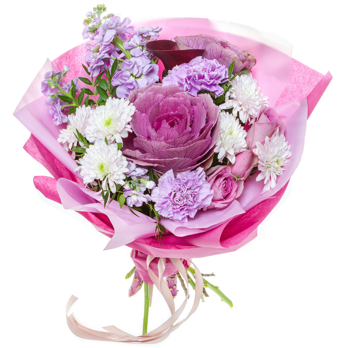 Маттиола сиреневая, брассика, гвоздика фиолетовая, хризантема кустовая белая, роза одноголовая розовая. Упаковка (лента, пленка, крафт, сетка, пленка матовая)