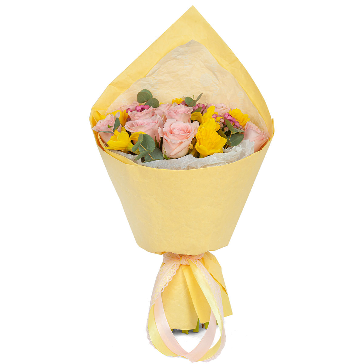 Роза одноголовая розовая, ирис желтый, эвкалипт. Упаковка (лента, пленка, крафт, сетка, пленка матовая)