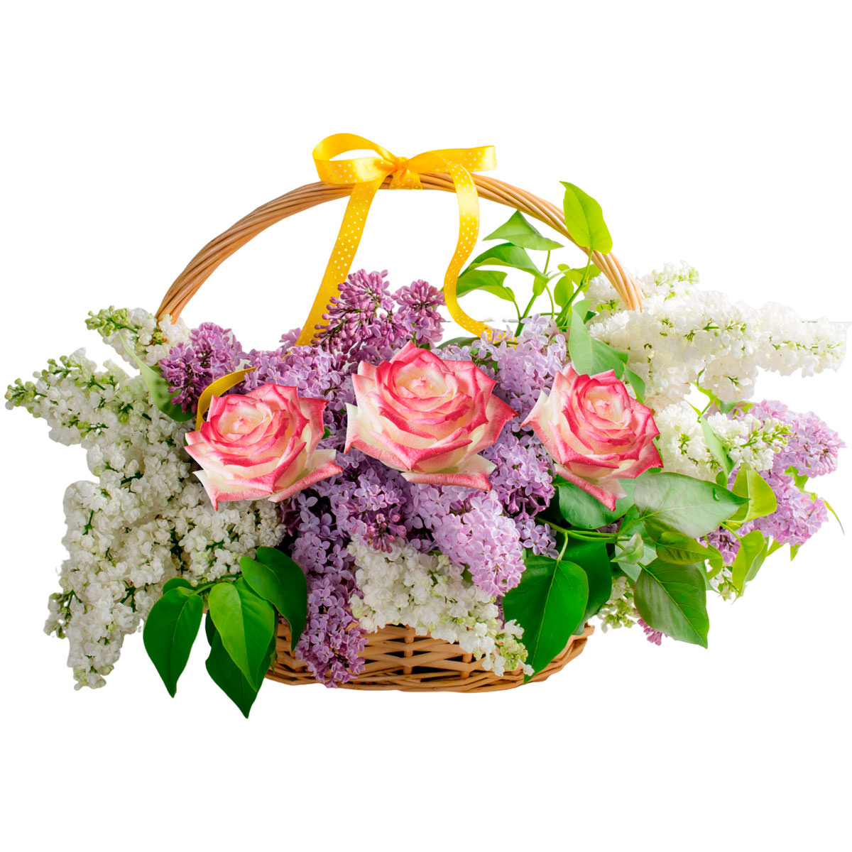 Роза одноголовая бело-розовая, сирень белая и сереневая. Упаковка (Корзина, оазис, ящик).