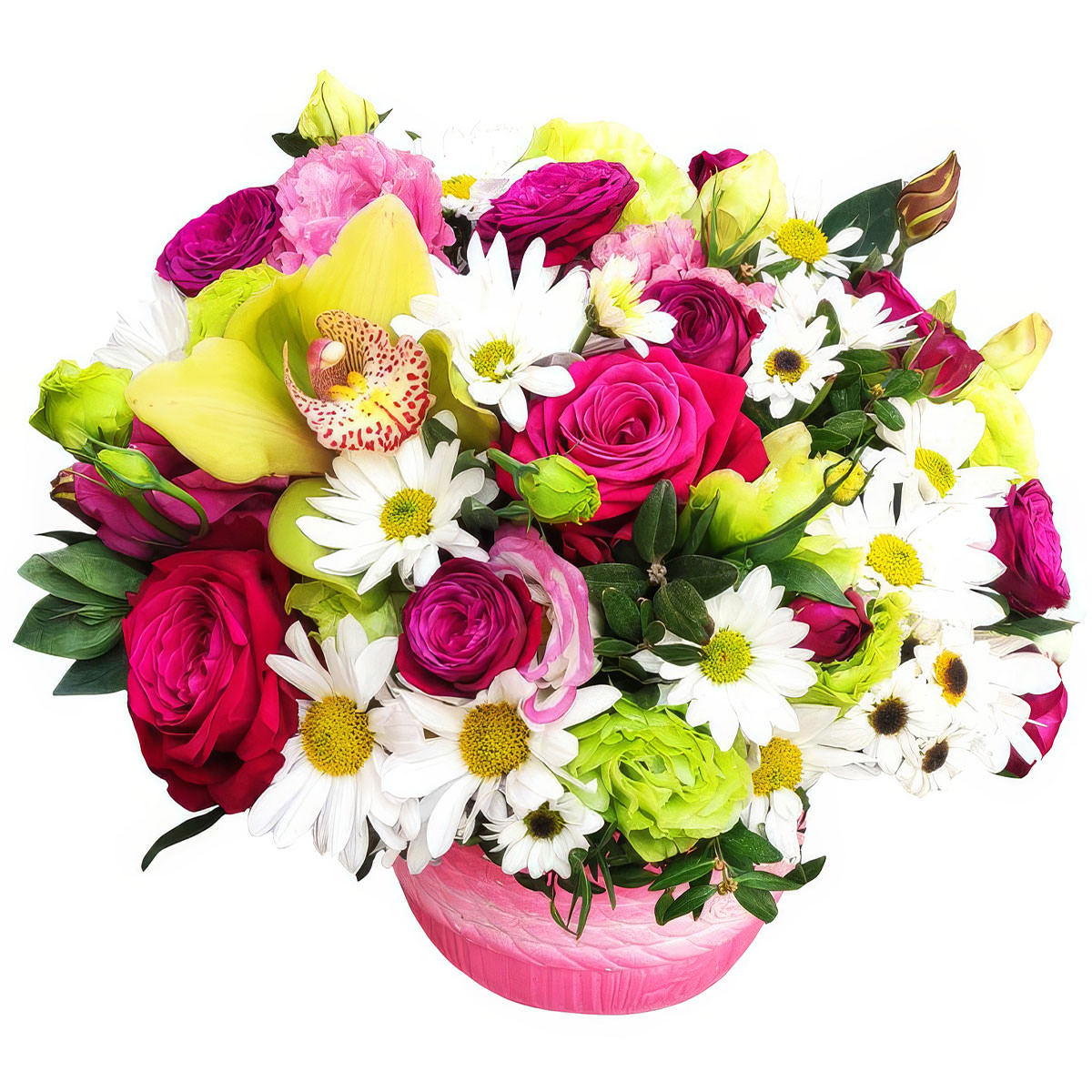Орхидея желтая, роза одноголовая розовая, эустома зеленая, ромашка белая крупная, хризантема кустовая белая, зелень. Упаковка (Корзина, оазис, ящик).