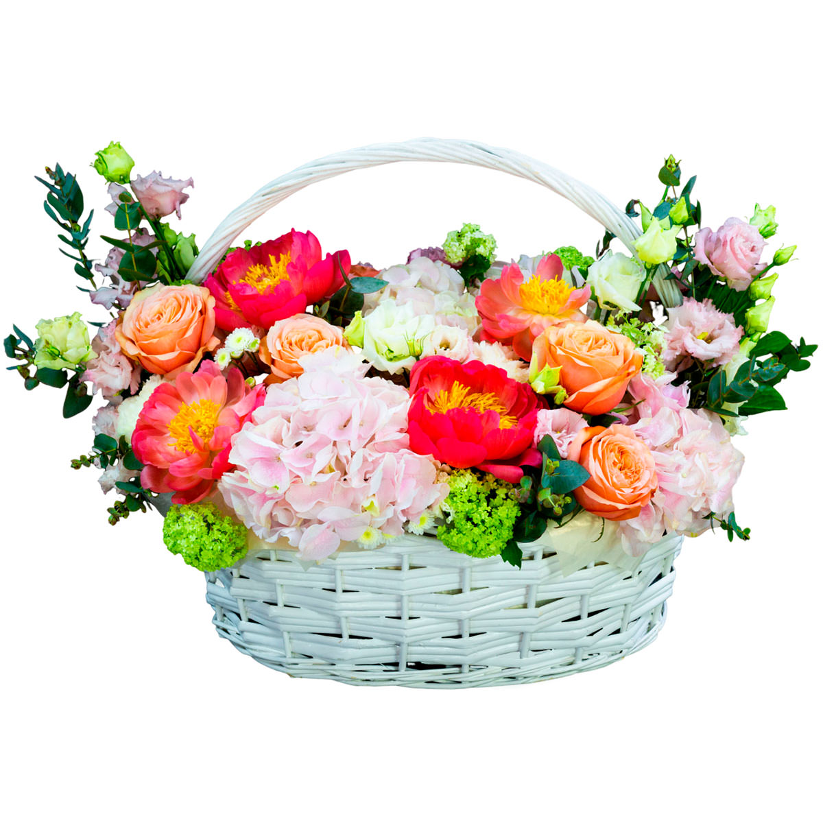 Гортензия розовая, пион коралловый, роза одноголовая персиковая, эустома розовая, вибурнум, маргаритка мини белая, эвкалипт. Упаковка (Корзина, оазис, ящик).
