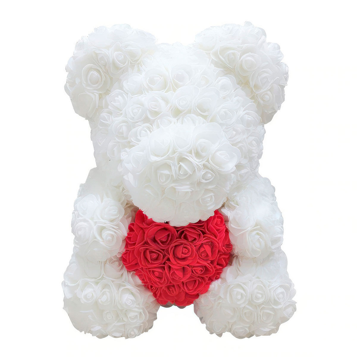 Мишка из роз белый с красным сердцем — созданный из более чем 600 великолепных 3D розочек.