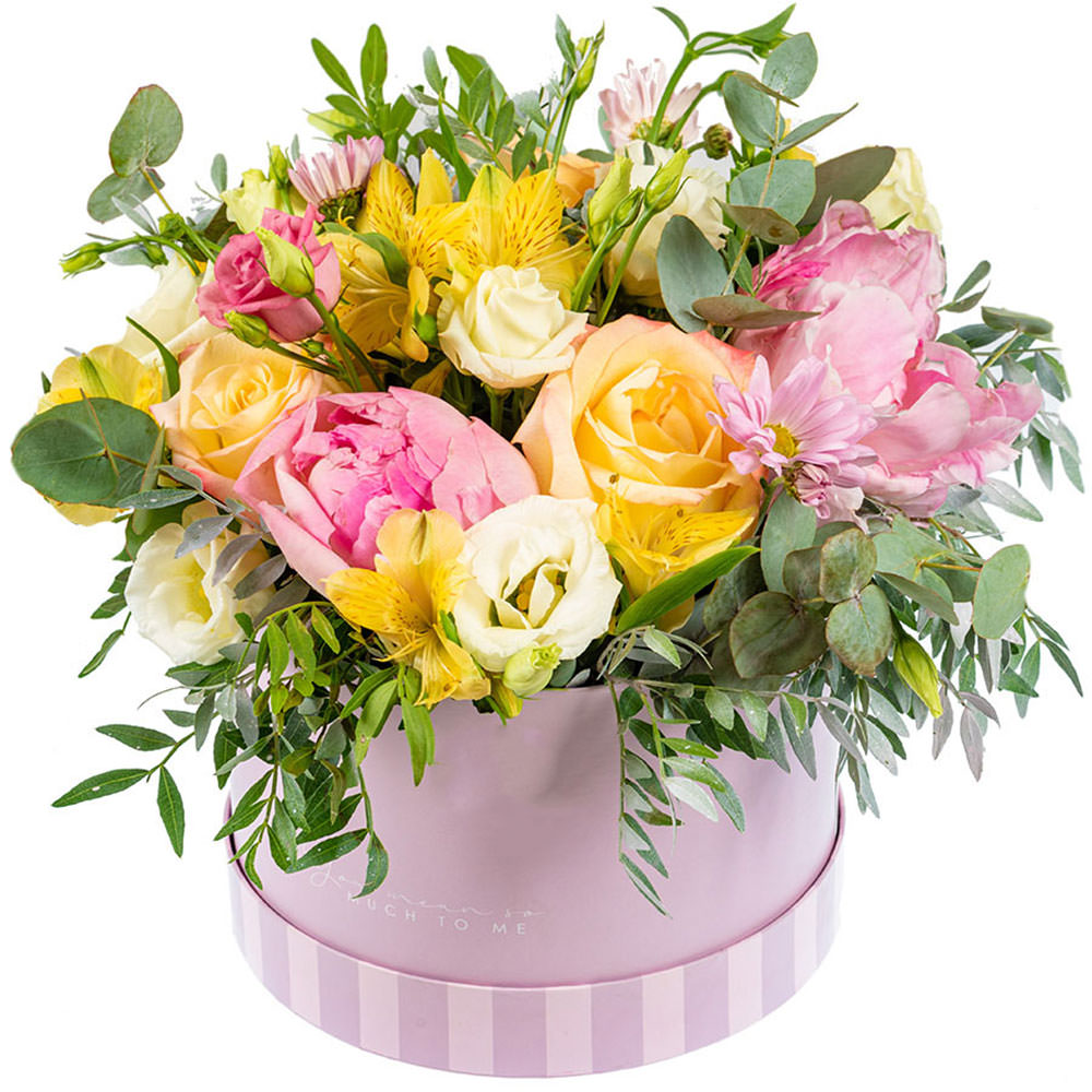 Пион розовый, роза одноголовая желтая, эустома белая, альстромерия желта, хризантема кустовая сиреневая, самшит, эвкалипт. Упаковка (шляпная коробка, квадратный бокс, коробка сердце, оазис)