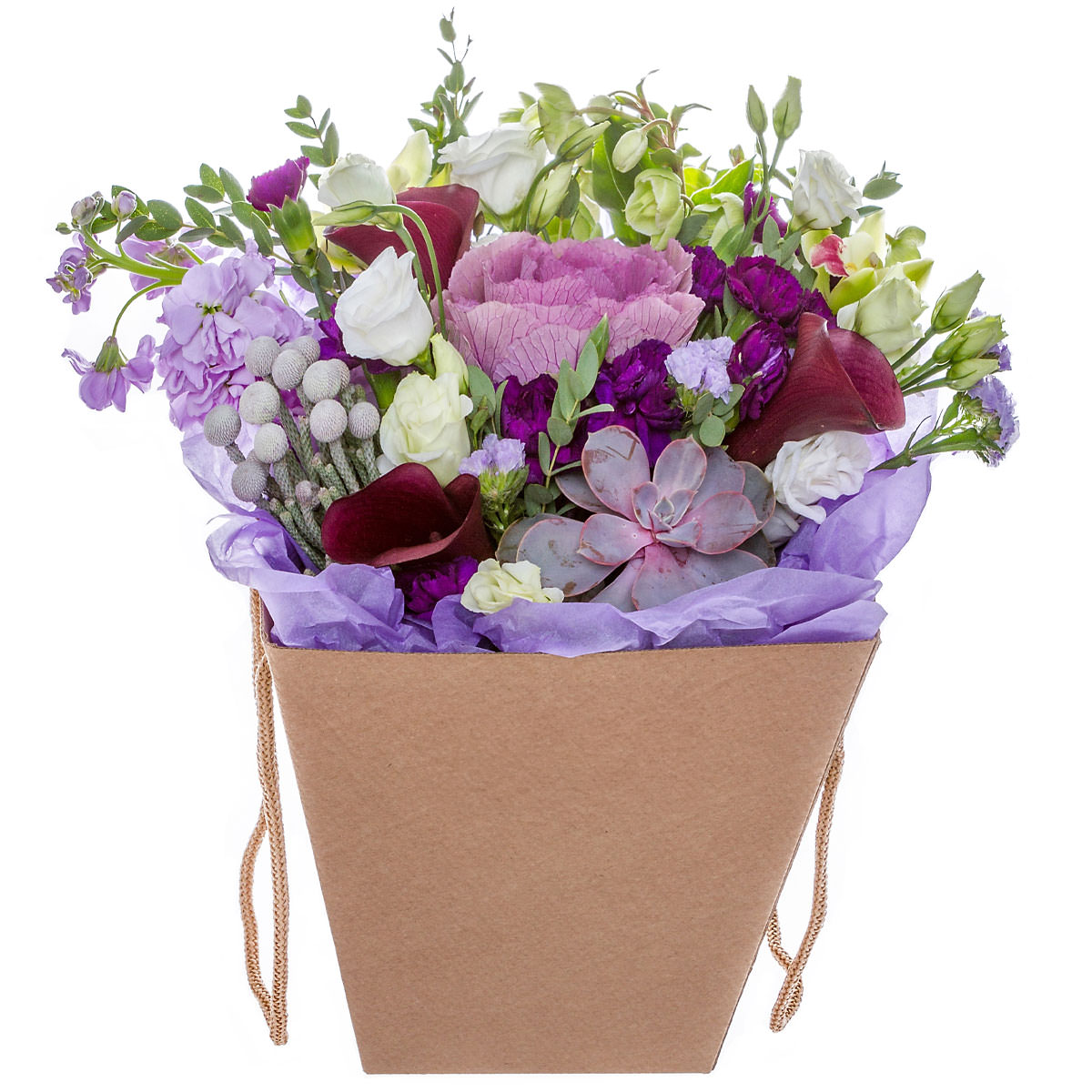Декоративная капуста, калла бордовая, эустома белая, маттиола сиреневая, суккулент, бруния, статица сиреневая, зелень. Упаковка (шляпная коробка, квадратный бокс, коробка сердце, оазис)