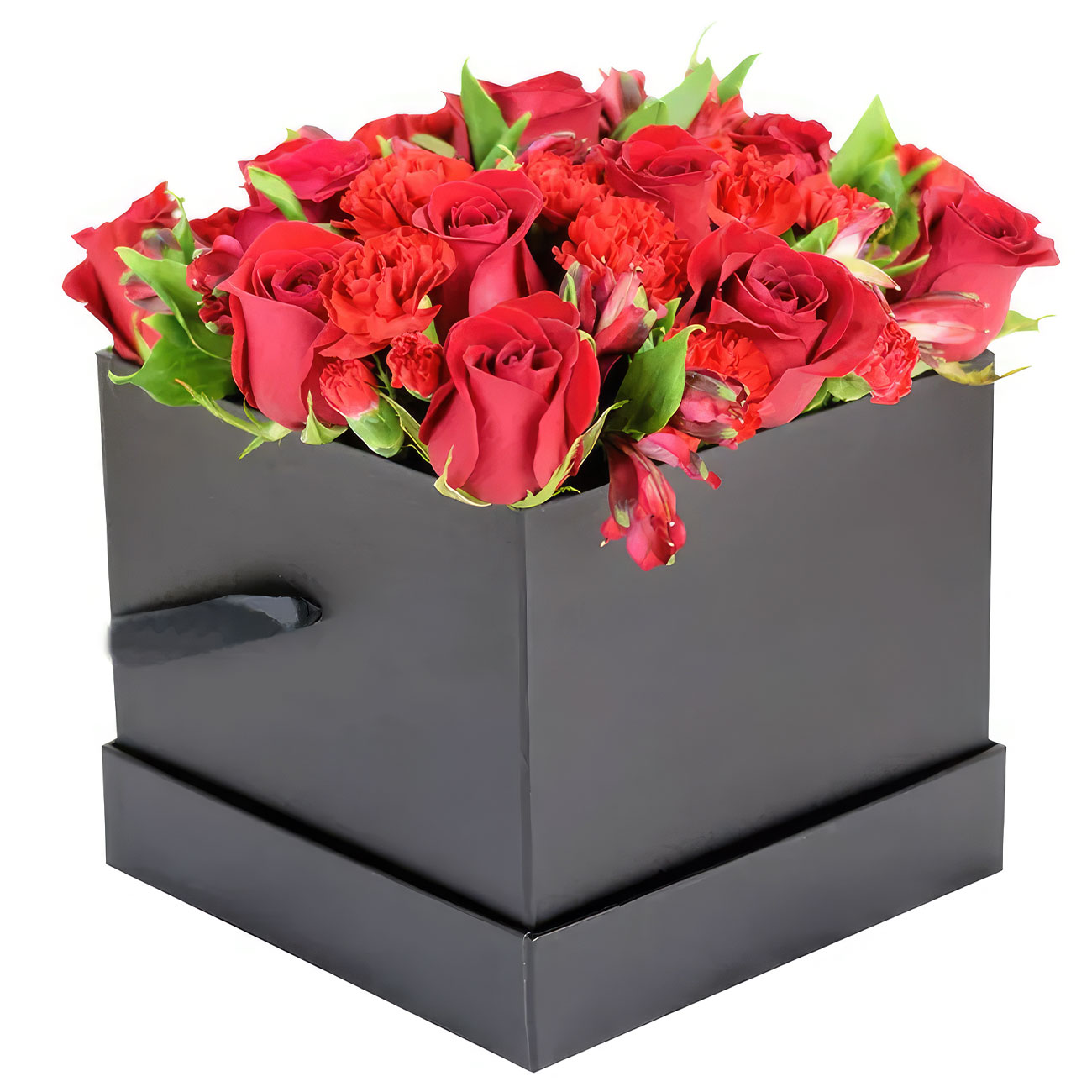 Роза одноголовая красная, гвоздика, альстромерия. Упаковка (шляпная коробка, квадратный бокс, коробка сердце, оазис)