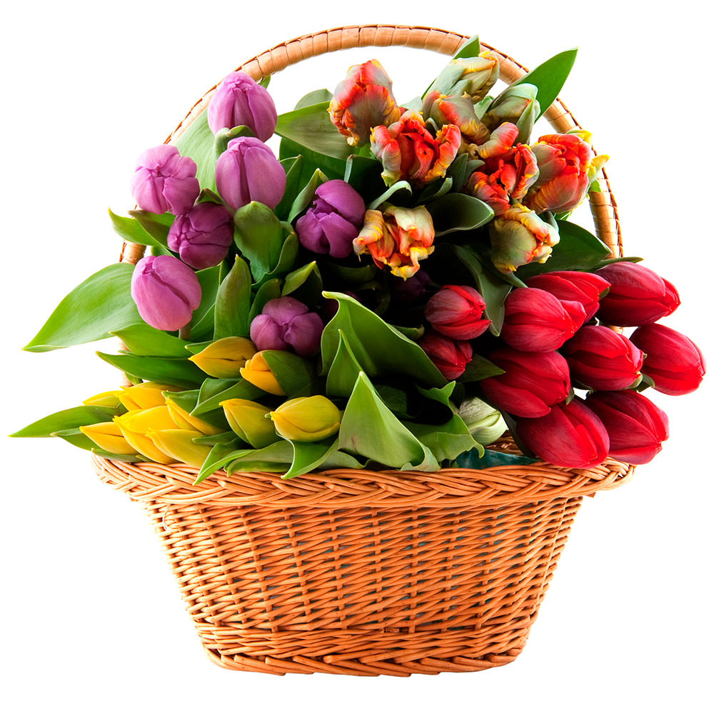 Тюльпаны микс (красный, желтый, оранжевый, сиреневый). Упаковка (Корзина, оазис).