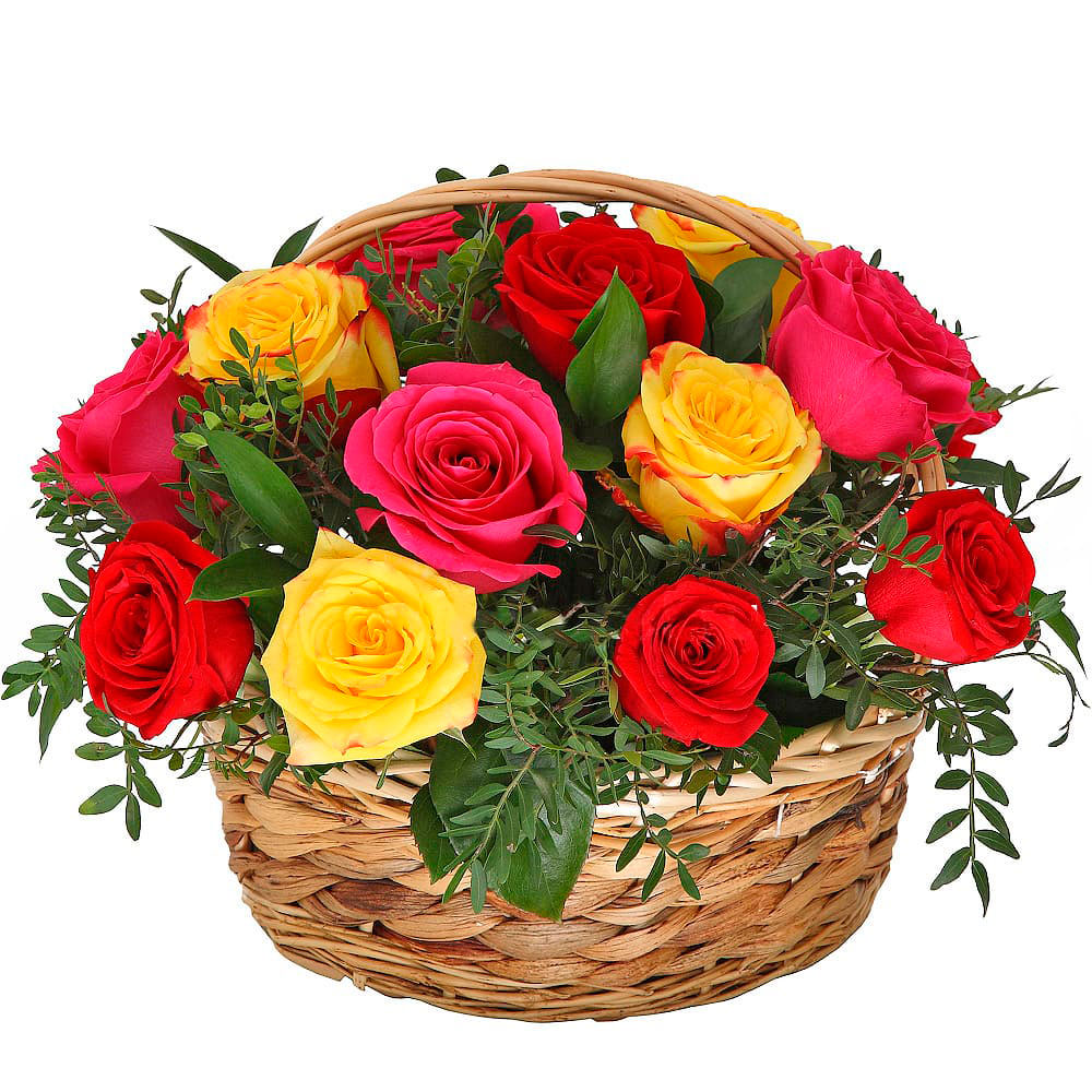 Роза одноголовая микс (желтая, розовая, красная), фисташка. Упаковка (Корзина, оазис).